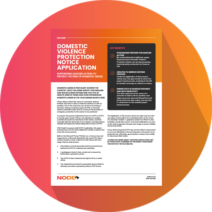 In domestic abuse cases, officers can issue a domestic violence protection notice (DVPN) or domestic violence protection order (DVPO) to person to be protected. Currently a heavily paper-based and time-consuming process, using Node4’s DVPN application to digitise this procedure will save time and increase effectiveness.